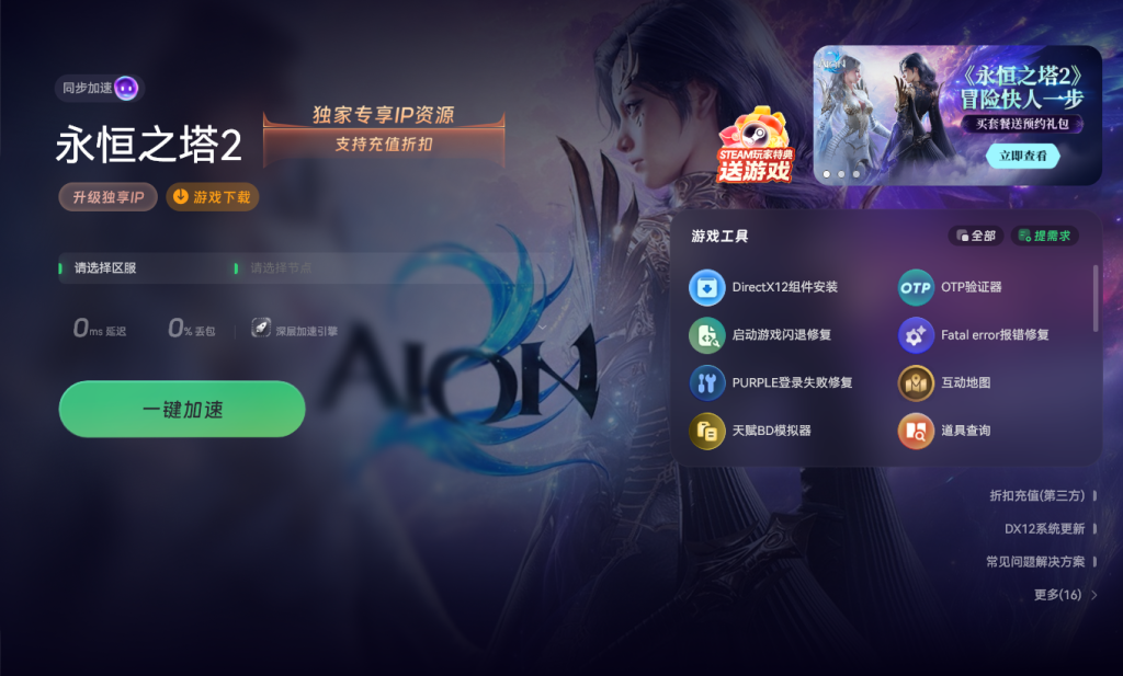 下载前需提前准备游戏加速工具,本次以奇游加速器为例。打开加速器后,在右上角搜索框输入 “永恒之塔 2”,找到对应游戏后进入加速界面并启动加速服务。