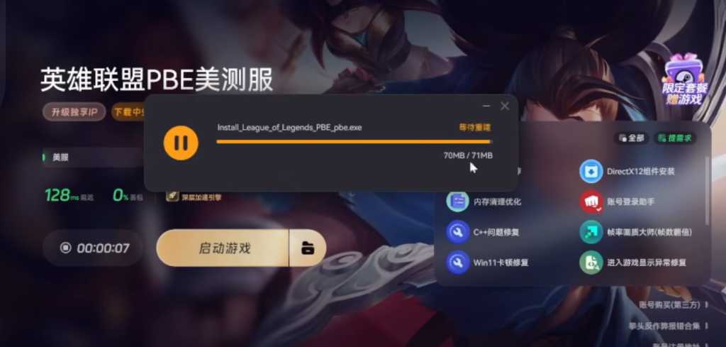 装好客户端之后,打开登录界面,登录进去后,在游戏库里找到英雄联盟PBE版,点一下就能开始下载游戏本体。因为文件比较大,这里可能需要多等一会儿。