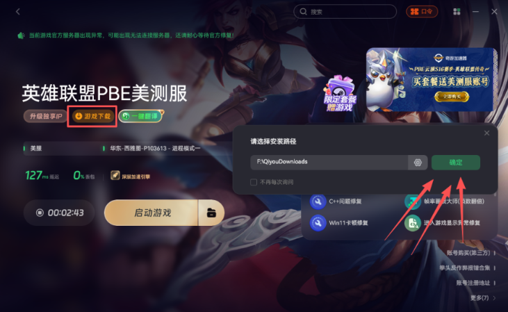 首先是账号问题,这是最关键的一步。你需要先下载一个奇游加速工具。打开之后,直接搜索“英雄联盟PBE美测服”。优化电脑本地网络的环境,从而解决下载缓慢等情况。手机党也有福利,奇游有手机加速版,加速页面能轻松切换,扫码就能得到 APP,随时随地加速都不会掉线。