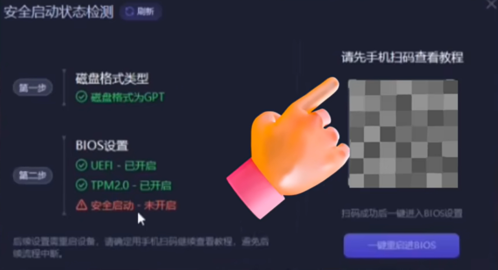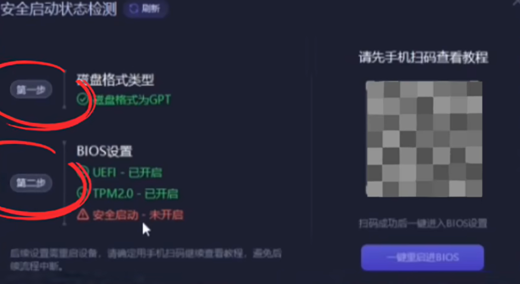 第二步是进入BIOS设置,不同型号的主板进入BIOS和开启安全模式的方法略有差异。大家可以扫描页面右侧的二维码,进入一个包含各类主板详细教程的界面。