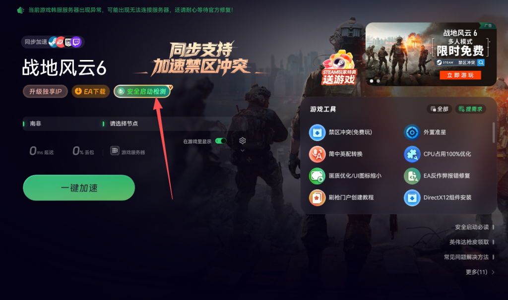 首先玩家们要准备好奇游加速工具。在工具中搜索战地6进行加速,加速完成后,点击安全启动检测选项。如果检测结果显示未开启安全启动,那就点击快捷设置进入相关页面。