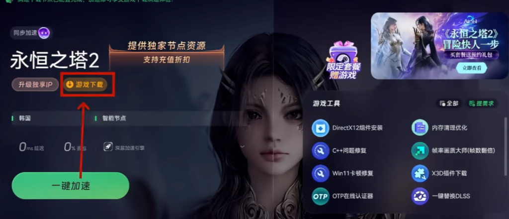 为确保下载过程以及后续游戏体验的流畅性,借助专业的网络加速工具十分必要。这里推荐使用奇游加速工具,使用奇游搜索永恒之塔2台服,点击一键加速选项。通过这一操作,能够有效改善网络连接状况,避免因网络问题导致下载中断或速度缓慢。