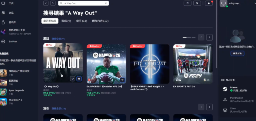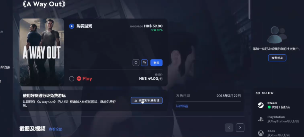 这款游戏支持一人购买、两人游玩的模式。若一方没有游戏本体,只需前往EA平台搜索A Way Out,下载免费的通行证版本即可。