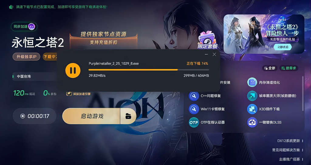 成功登录purple平台后,在界面左侧找到store菜单点击,进入商店页面,就能轻松找到永恒之塔2的游戏页面。直接点击下载按钮,游戏客户端便开始下载了。