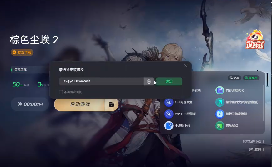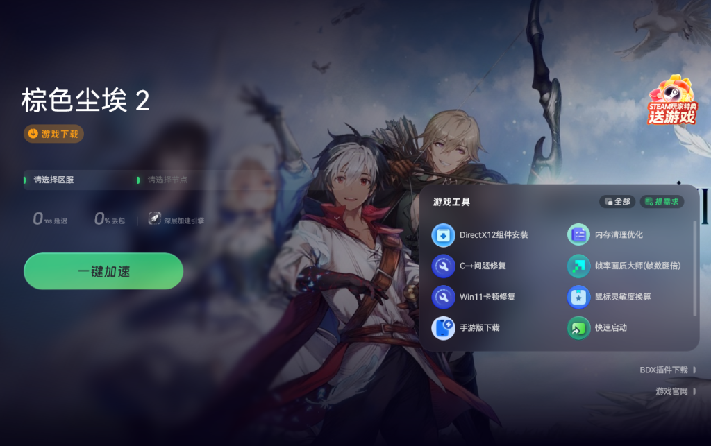 首先要借助专业的网络加速工具来保障下载过程的顺畅。这里推荐使用奇游加速工具,打开它后,在搜索栏输入棕色尘埃2,然后点击一键加速按钮。待加速操作完成后,我们就可以开始下载游戏了。