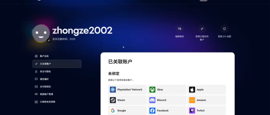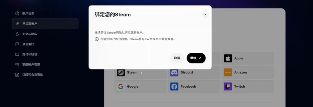 接下来是关键的一步——将EA账号绑定Steam账号。登录EA账号后找到与Steam绑定的相关选项。