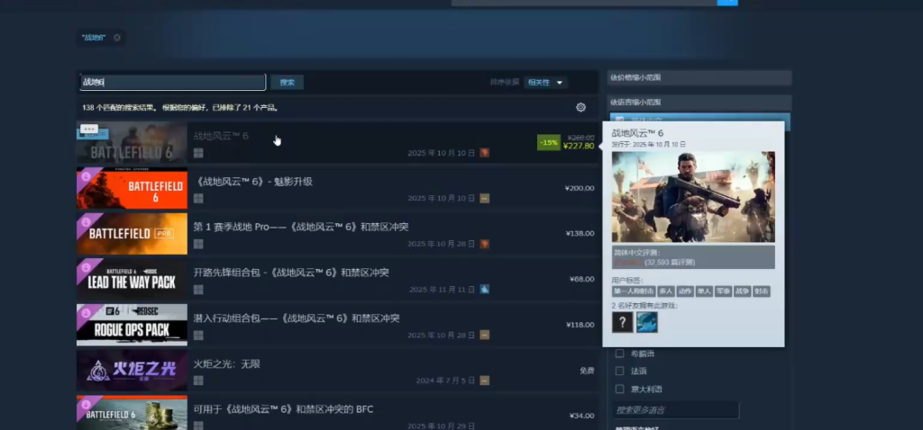 首先是游戏下载环节。玩家需打开Steam平台,在搜索栏输入战地6,在搜索结果页面往下翻。