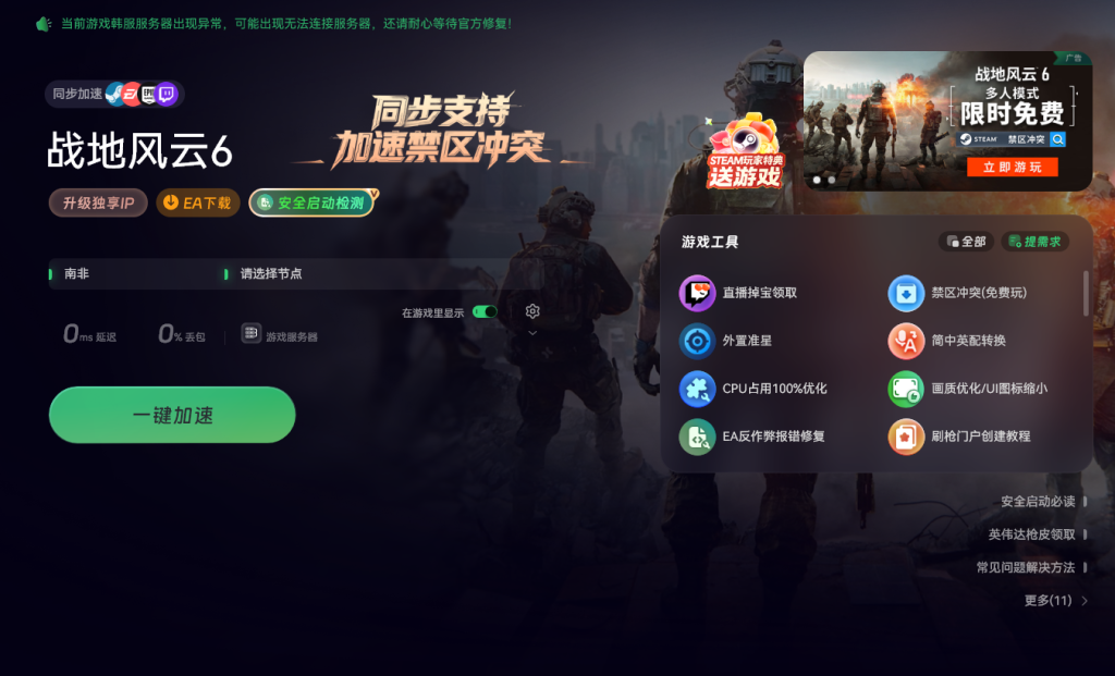 在下载游戏的同时,为了确保后续登录和游玩的网络稳定性,建议大家准备一个奇游加速工具。打开奇游加速工具,在搜索框输入战地6,选择合适的节点进行加速。