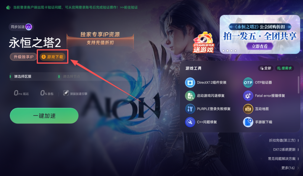 最后一步是下载游戏,在游戏库里面搜索“永恒之塔2”,找到之后直接点击下载。平台一般会根据你的网络自动分配合适的节点,等它下载完成,就可以开始体验游戏了。