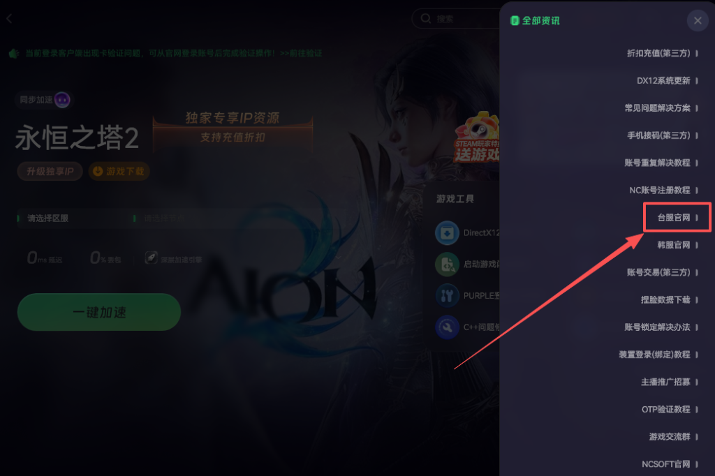 加速开启之后,就可以通过加速工具里面提供的链接,直接跳转到《永恒之塔2》的台服官网,同时也能把游戏客户端下载下来。