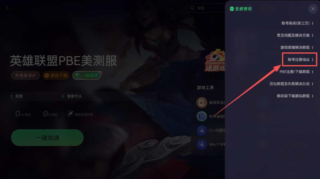 加速成功之后,在加速页面的右侧一般会有一个“PBE美测服注册”的入口,点进去就能开始注册账号了。