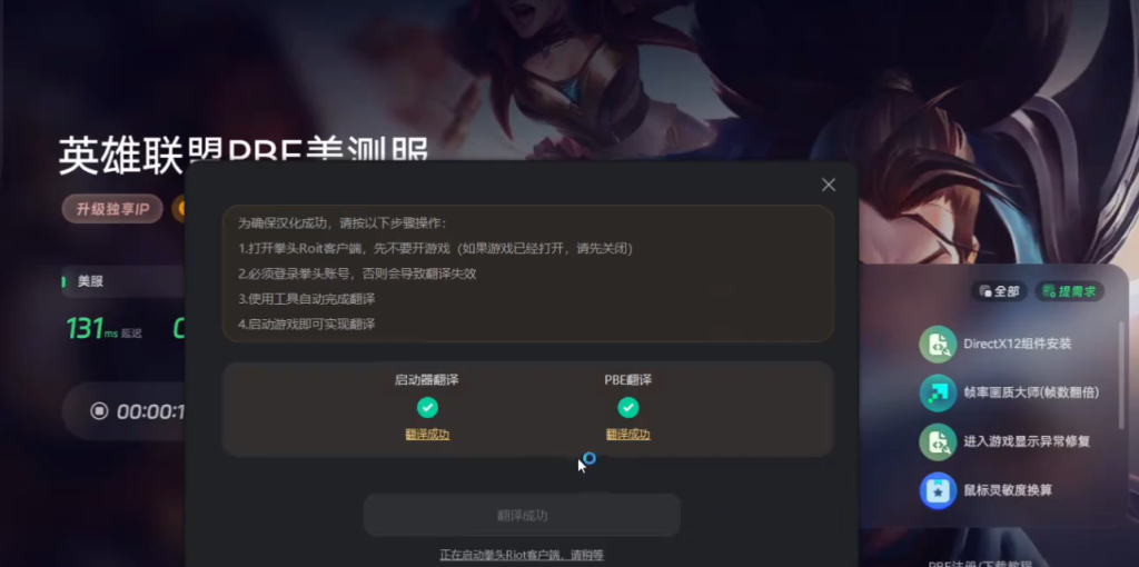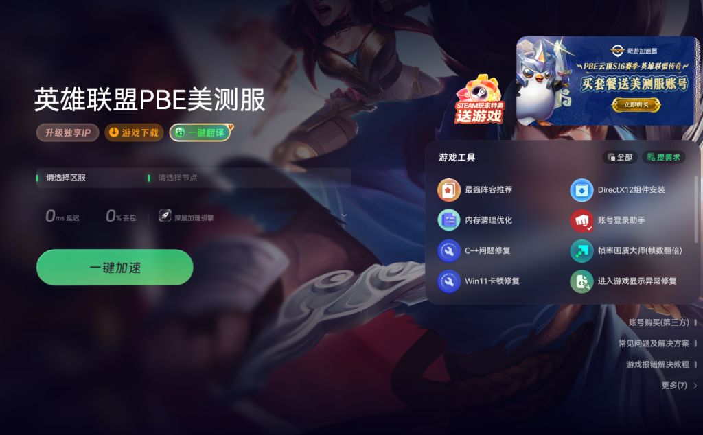 美测服的流程相对复杂一些。首先要准备一个奇游加速工具。打开奇游后在右上角输入PPE520,就能获取一个美测服账号以及加速时长。之后在加速器中搜索PBE美测服,进入后点击一键加速。