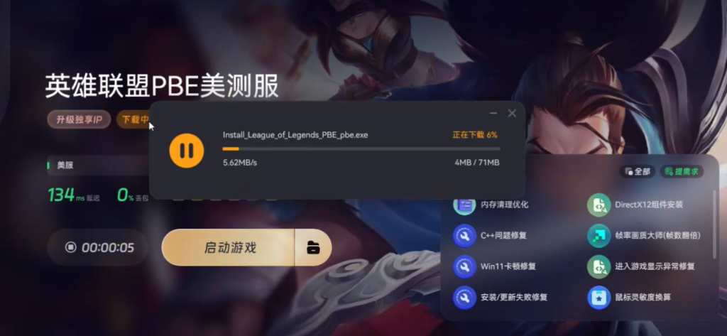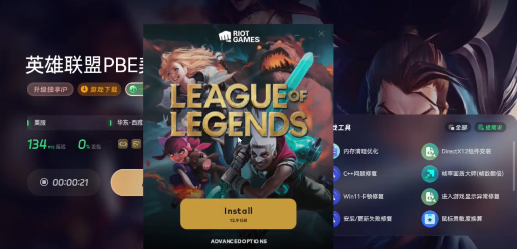 加速完成后,点击上方的游戏下载,下载拳头启动器。下载完成后,点击立即安装,再点击下方选项进行更改,安装完成后会自动打开拳头客户端。