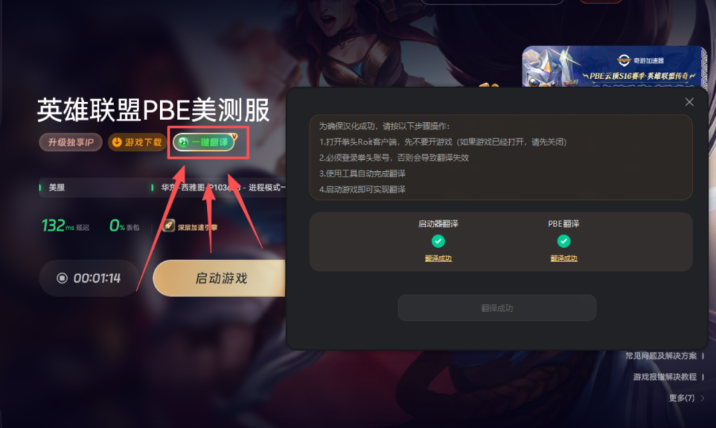 前置文件下载完毕后,回到奇游加速工具界面,点击绿色的一键翻译按钮。该功能能够对客户端和游戏界面进行全面汉化,让我们在游玩过程中不再受语言障碍的困扰,更轻松地理解游戏内容。