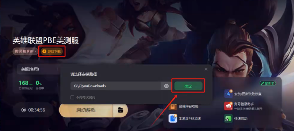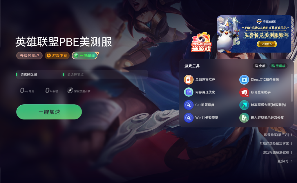 对于PC端玩家来说,优化网络环境是开启美测服之旅的第一步。这里推荐大家使用奇游加速工具,搜索英雄联盟PBE美测服,选择对应的加速选项,为后续操作提供稳定的网络支持。