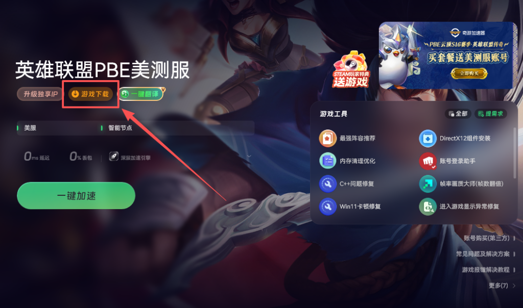 账号注册好之后,接下来就是下载游戏。保持奇游加速状态,直接在客户端里点击“PBE一键下载”,系统会自动分配高速节点,帮你快速下载安装包。
