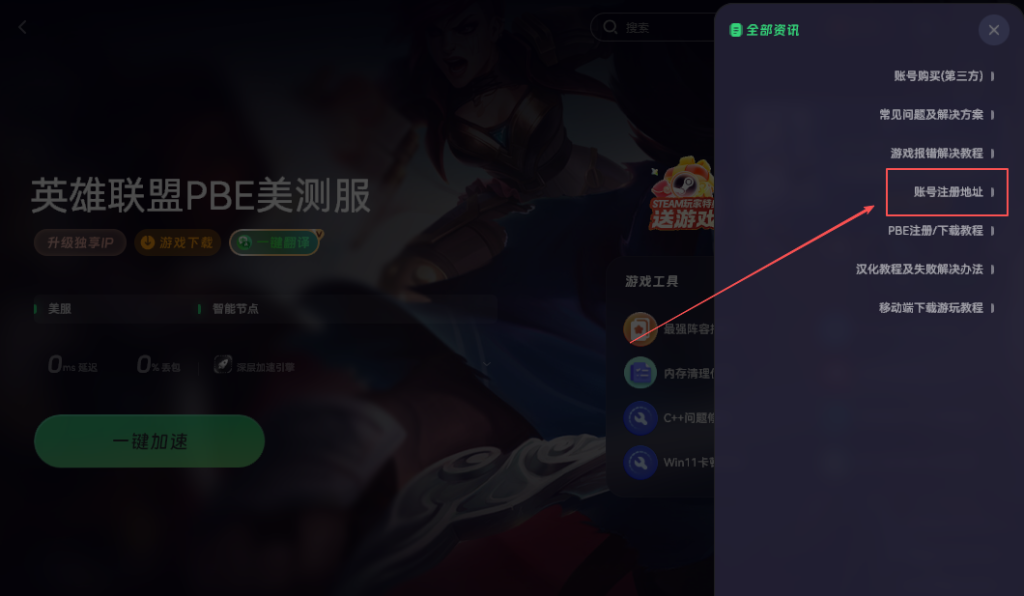 加速成功之后,你会在加速页面的右侧看到PBE美测服的注册入口,点击进入就可以开始注册账号了。