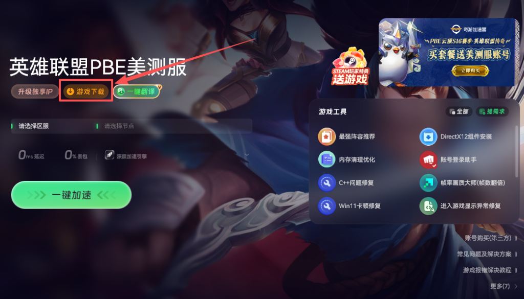 打开奇游加速工具之后,接着搜索“PBE美测服”,点“一键加速”。手机党也有福利,奇游有手机加速版,加速页面能轻松切换,扫码就能得到 APP,随时随地加速都不会掉线。