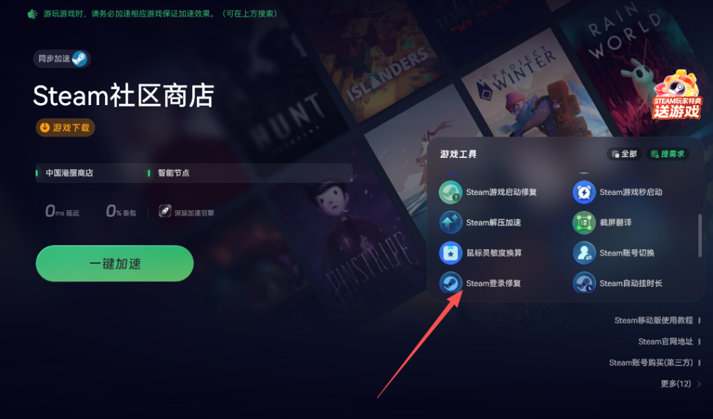 有时候Steam客户端本身可能出现一些小故障,导致游戏无法正常启动。奇游加速工具右侧的工具栏中,有专门的Steam登录修复功能。该功能能够自动检测并修复Steam客户端存在的问题,比如登录异常、文件损坏等。点击该功能后,工具会自动进行修复操作,修复完成后重新进入Steam,再启动游戏,通常就能顺利进入游戏了。