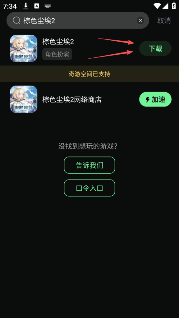 首先PC端奇游支持一键下载,打开奇游加速《棕色尘埃2》点击橙色的游戏下载