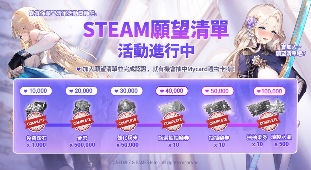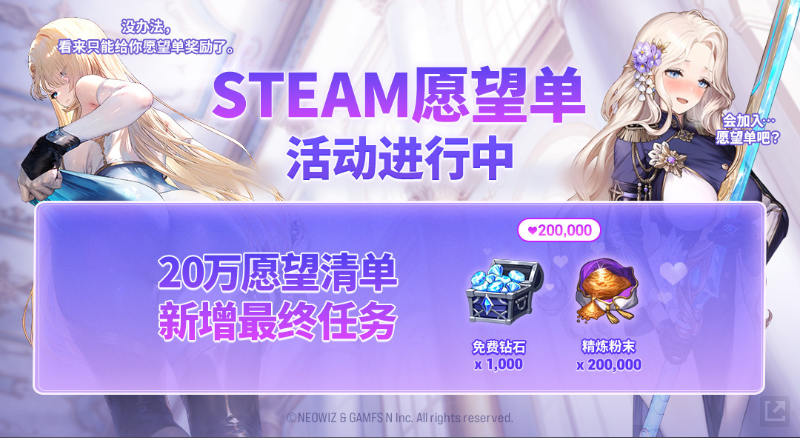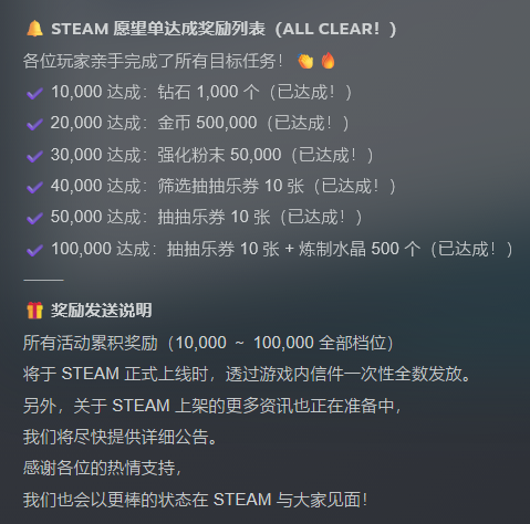 除了已达成的这些奖励 steam版还追加20w愿望单奖励