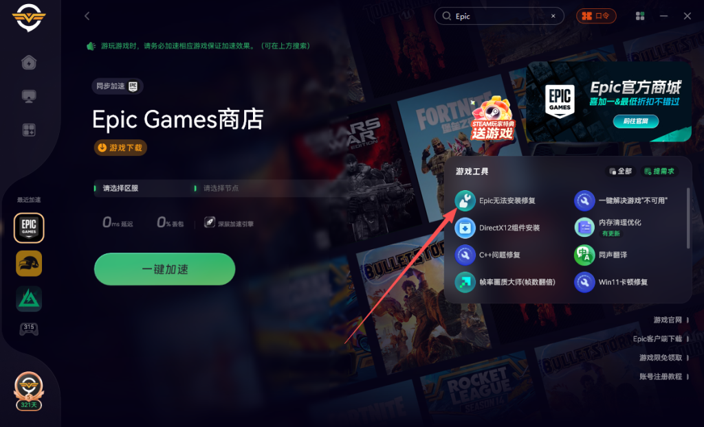 Epic平台无法安装解决办法 奇游加速器官方 2025-12-04 1. 在加速器中下载Epic无法安装修复工具; 2. 以管理员权限运行该工具进行安装操作; 3. 安装完成后启动该工具; 4. 选择Epic相关文件后点击remove 5. 重新下载安装Epic平台即可;