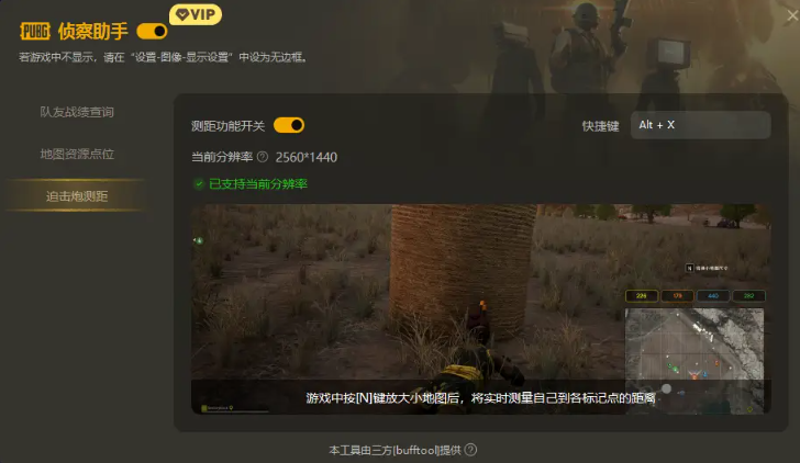 - 打开测距功能开关,若显示已支持当前分辨率,且在游戏画面右侧显示四色框,代表工具正常运行