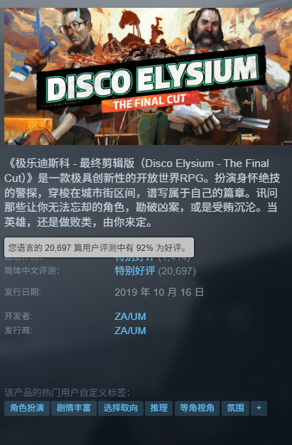 该游戏在steam有2万名玩家给出92%特别好评