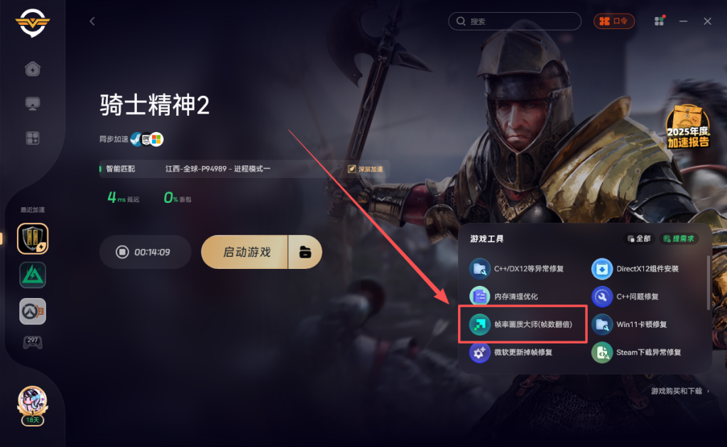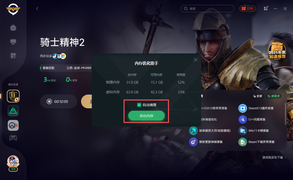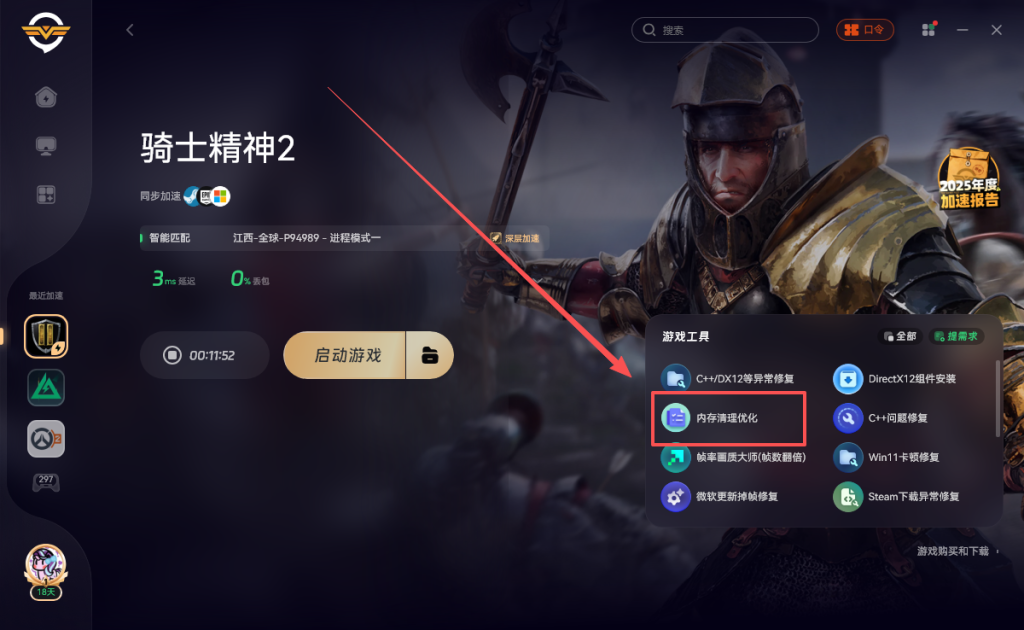 奇游支持一键清理内存,打开奇游加速《骑士精神2》点击右侧的内存清理优化