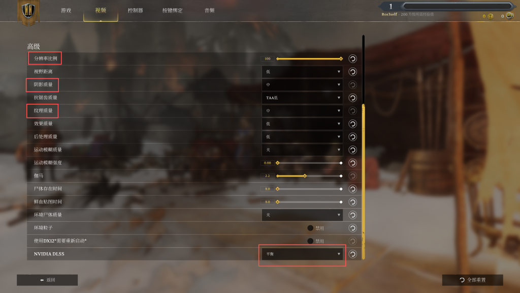下面的分辨率比例100,纹理根据显存大小进行调整,阴影影响不大可以开中,DLSS建议平衡,其他直接照抄我的