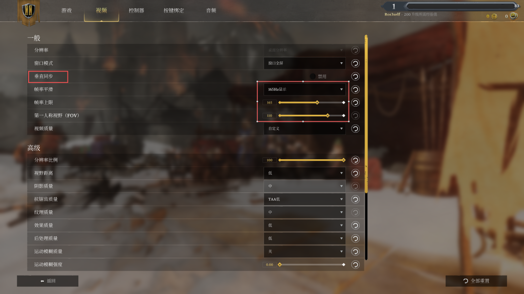 首先画面设置,关闭垂直同步,帧率平滑和上限选择你显示器支持最大值,FOV110