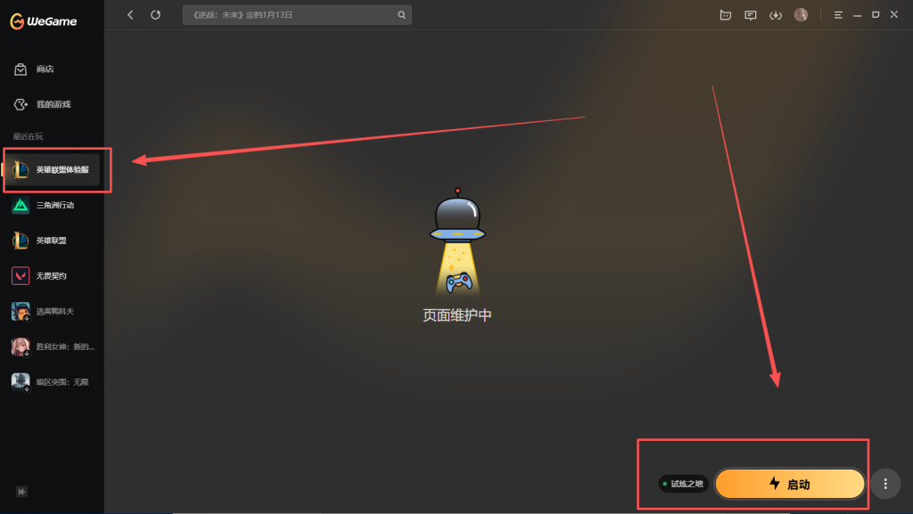 安装完成后进入wegame选择英雄联盟体验服试炼之地大区