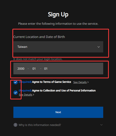 3.选择【Taiwan】地区,填写生日日期后,勾选下方两个按钮