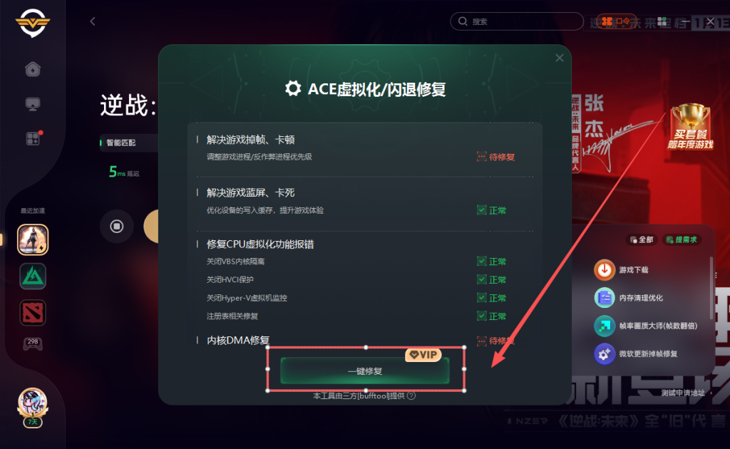 点击一键修复可以一设置游戏进程优先级、优化设备写入缓存,调整系统设置