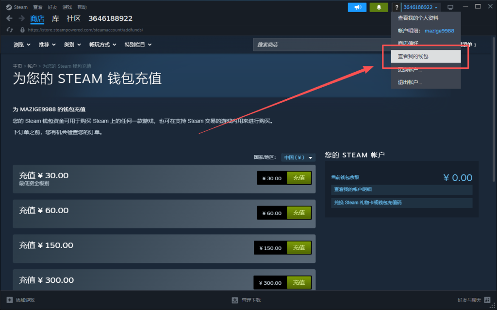 然后在steam客户端点击右上角查看我的钱包