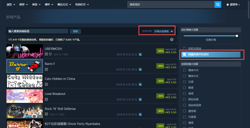 选择价格由低到高勾选排除免费游戏