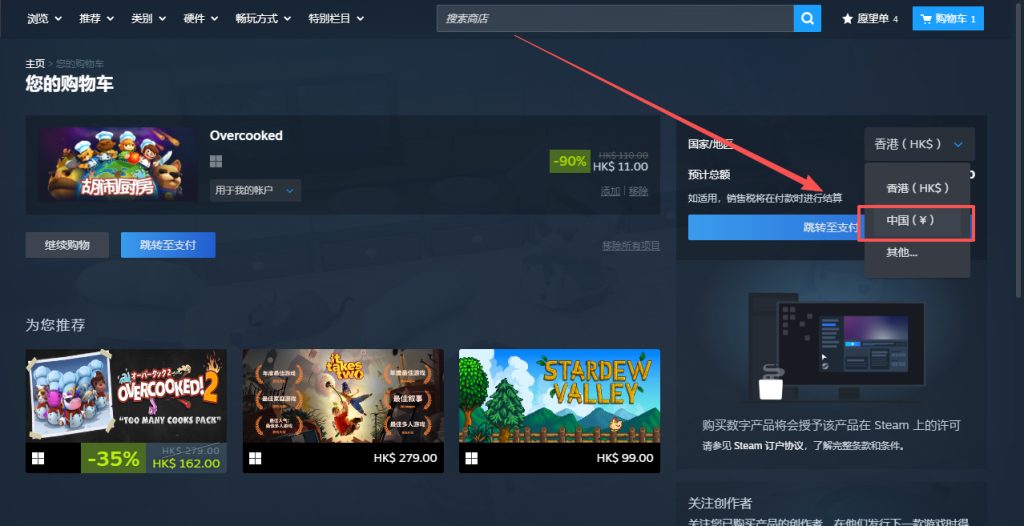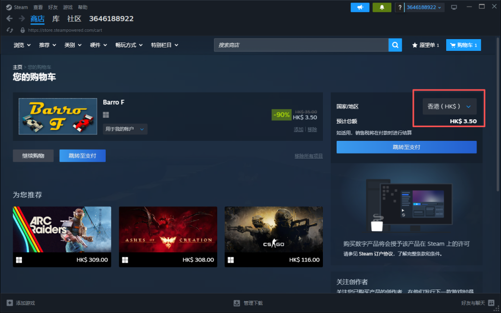 选择一个最便宜的游戏,在购物车使用港币结账付款入库