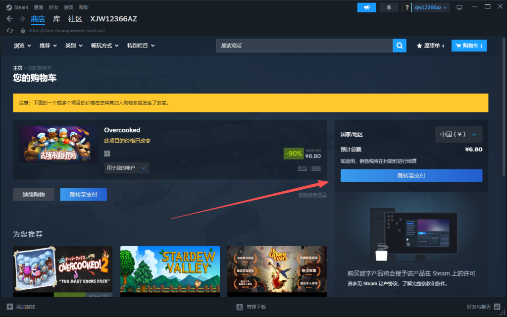 在steam商店随便找一款便宜的游戏或者你喜欢的游戏,然后在购物车选择人民币并确认