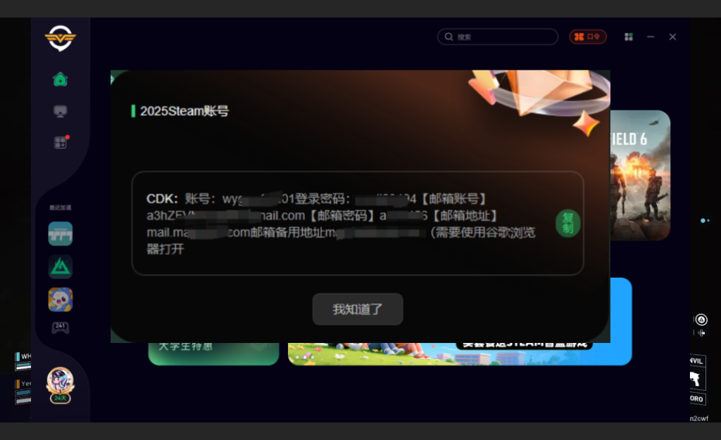 小编给大家准备好了一波外区steam账号打开奇游点击口令输入【白嫖steam】