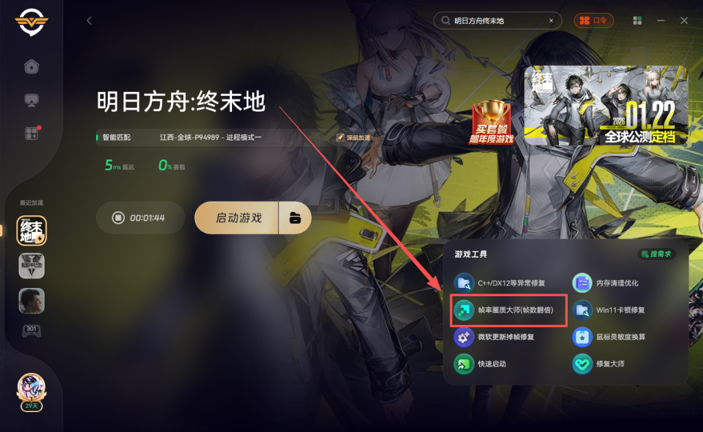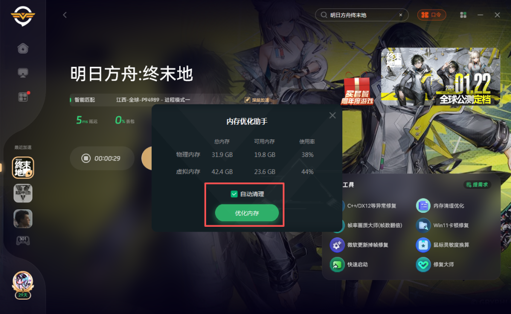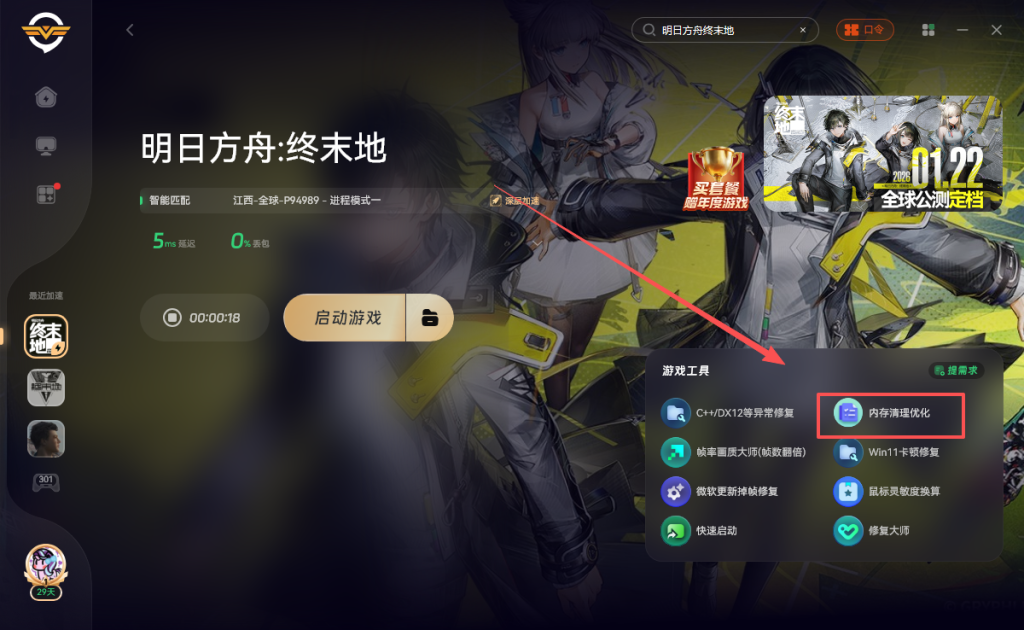 奇游支持一键清理,打开奇游加速《明日方舟终末地》点击右侧的内存清理优化