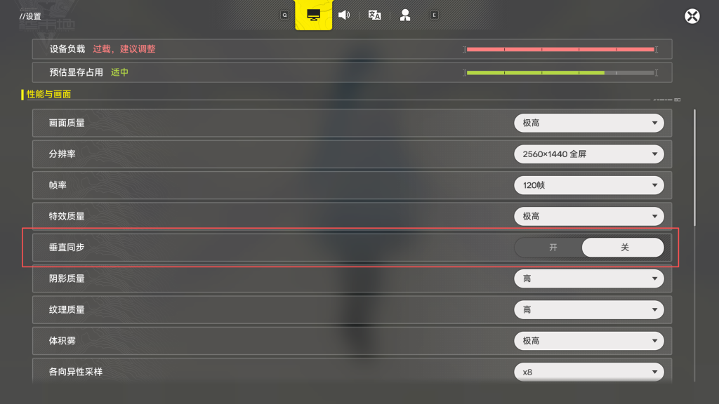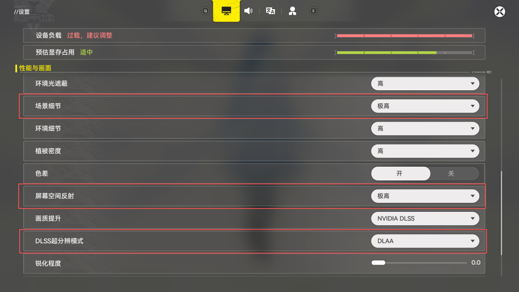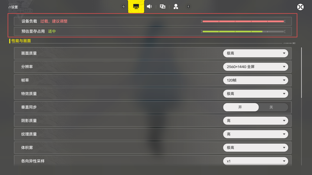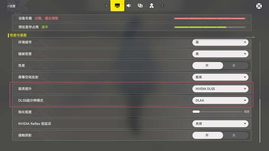 进入游戏画面设置,现在设置顶部有一个负载条