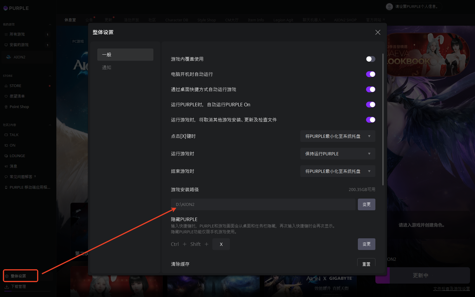 1.重新下载或更新PURPLE后,如出现找不到游戏,请点击【整体设置】