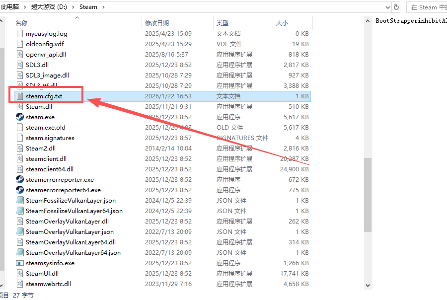 我们在steam的文件夹里找到steam.cfg的文本