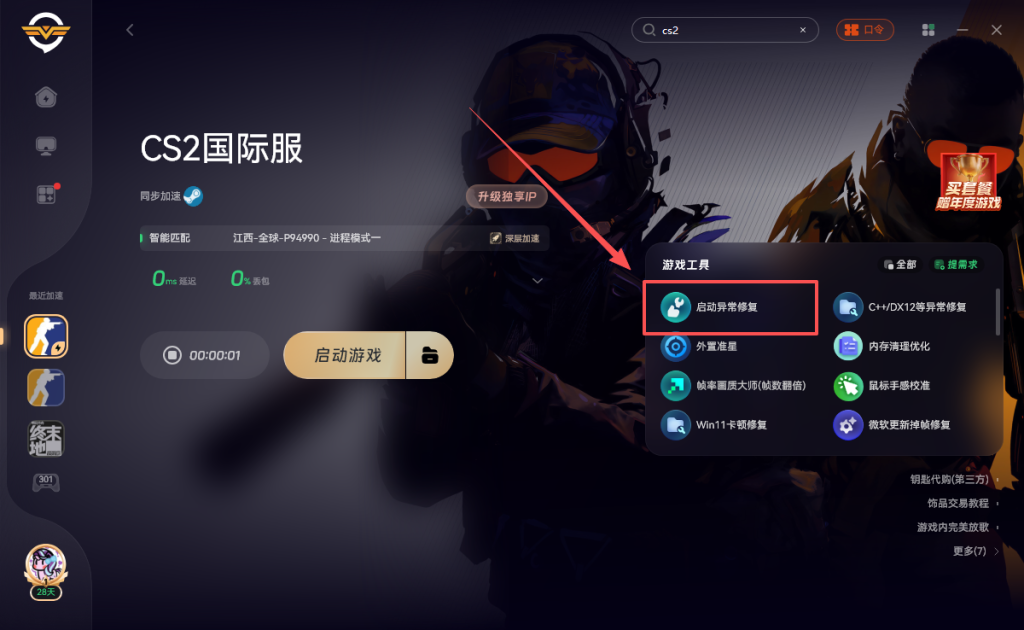 可以打开奇游加速《CS2》点击右侧的启动异常修复