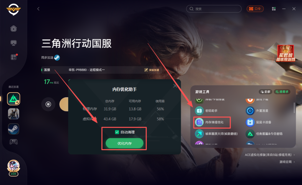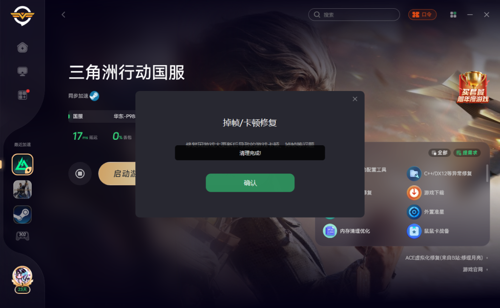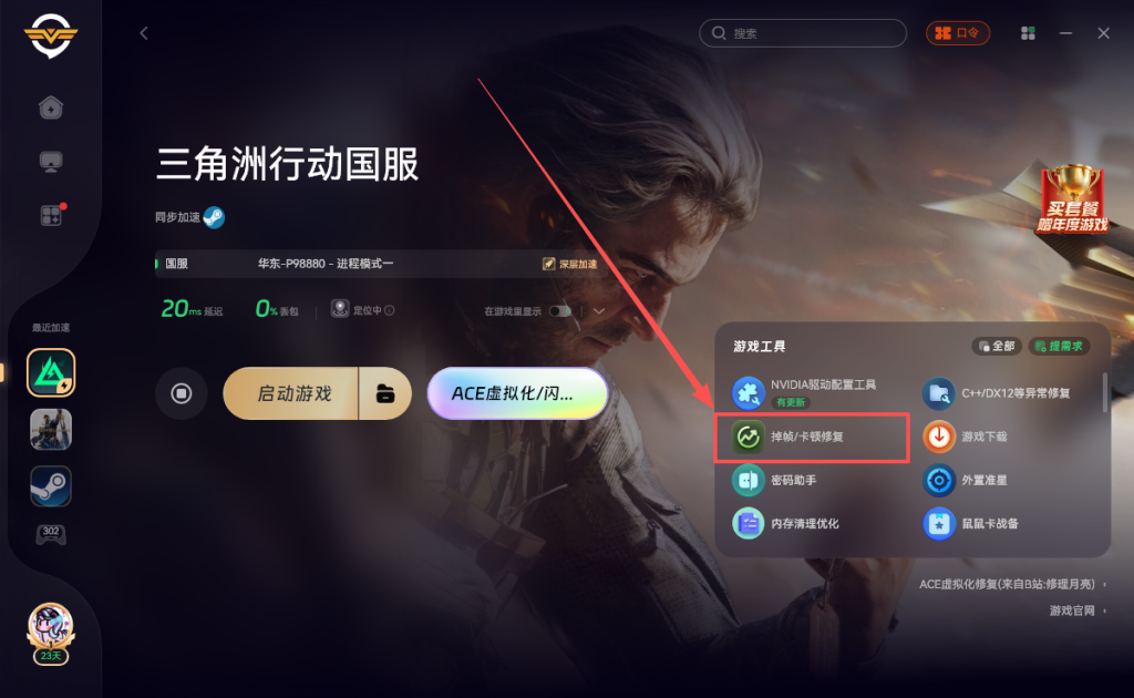 奇游支持一键清理,打开奇游加速《三角洲行动》点击右侧的掉帧卡顿修复