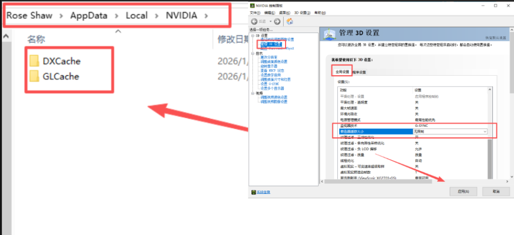 接着设置着色器缓存大小,打开N卡控制面板,点击管理3D设置,把全局设置中的着色器缓存大小改为无限制并应用即可,可以有效改善卡顿掉帧的问题