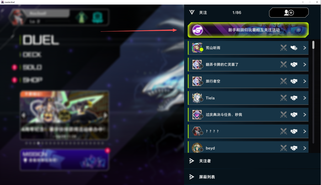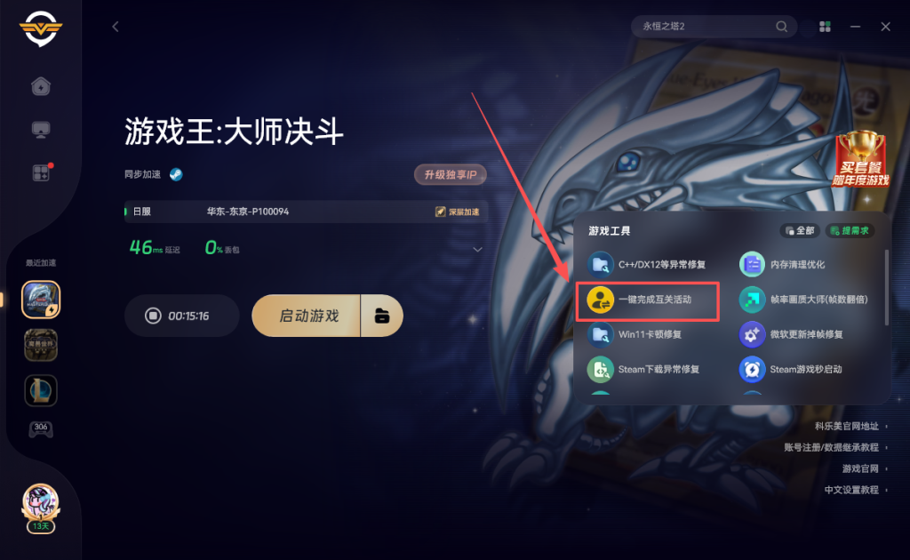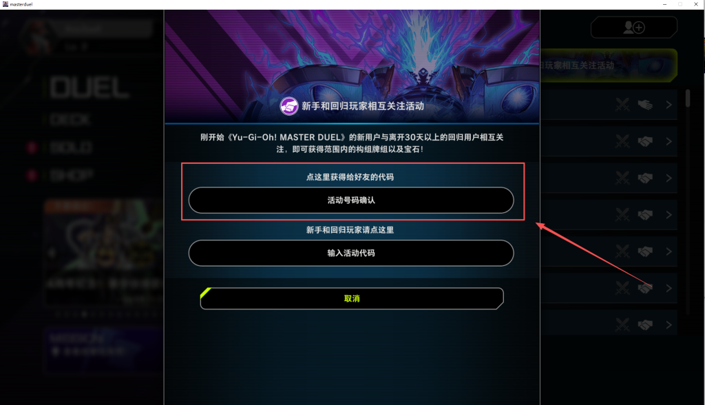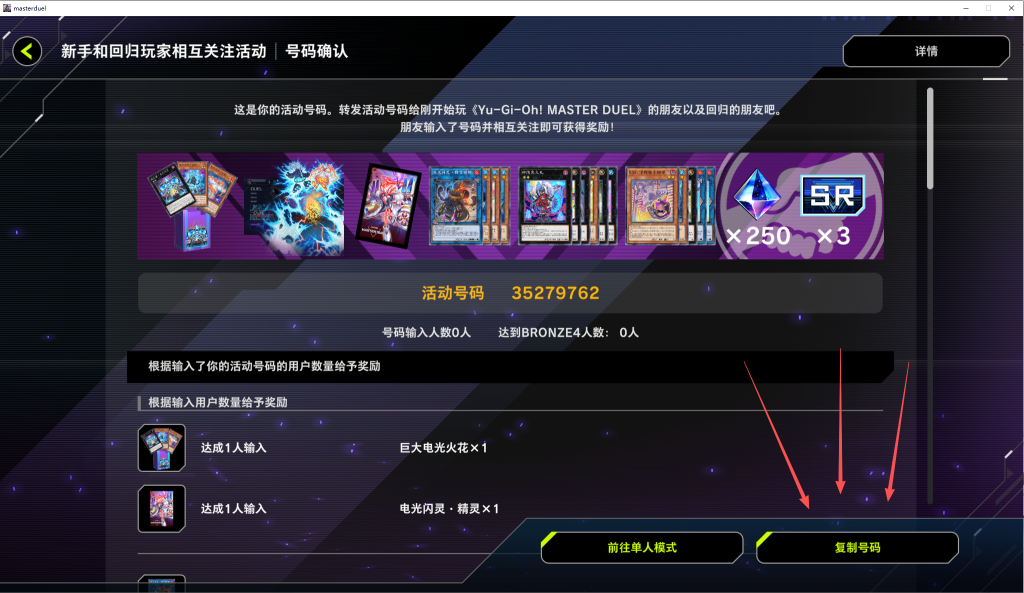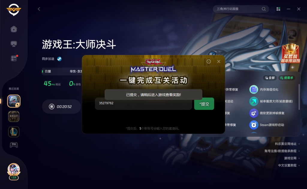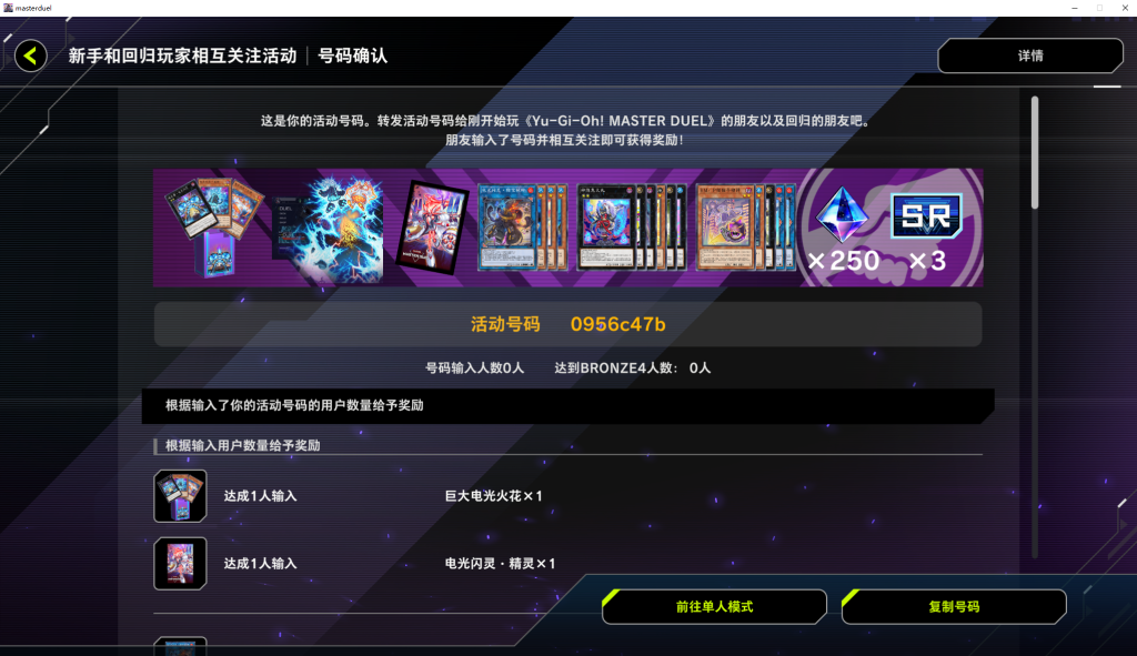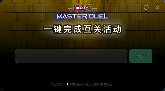 一键领取《游戏王大师决斗》四周年互关活动奖励!无需手动无需求人一键搞定! 奇游加速器官方 2026-02-05 一键领取游戏王大师决斗四周年全部奖励 这个活动需要通过邀请码邀请新玩家或者回归玩家 输入你的邀请码,即可获得奖励,最多可以邀请5位玩家。 现在奇游推出了一键邀请功能无需手动一键搞定 奇游加速《游戏王大师决斗》点击右侧的一键完成互关活动工具 之后我们在游戏中点击好友 新手和回归玩家相互关注活动 活动号码确认 点击右下角的复制号码 粘贴进奇游的一键完成互关活动并提交 等待几分钟就会有神秘力量,用你的邀请码邀请5个新号完成活动任务了 以上就是关于游戏王大师决斗的全部内容,希望对你有所帮助。