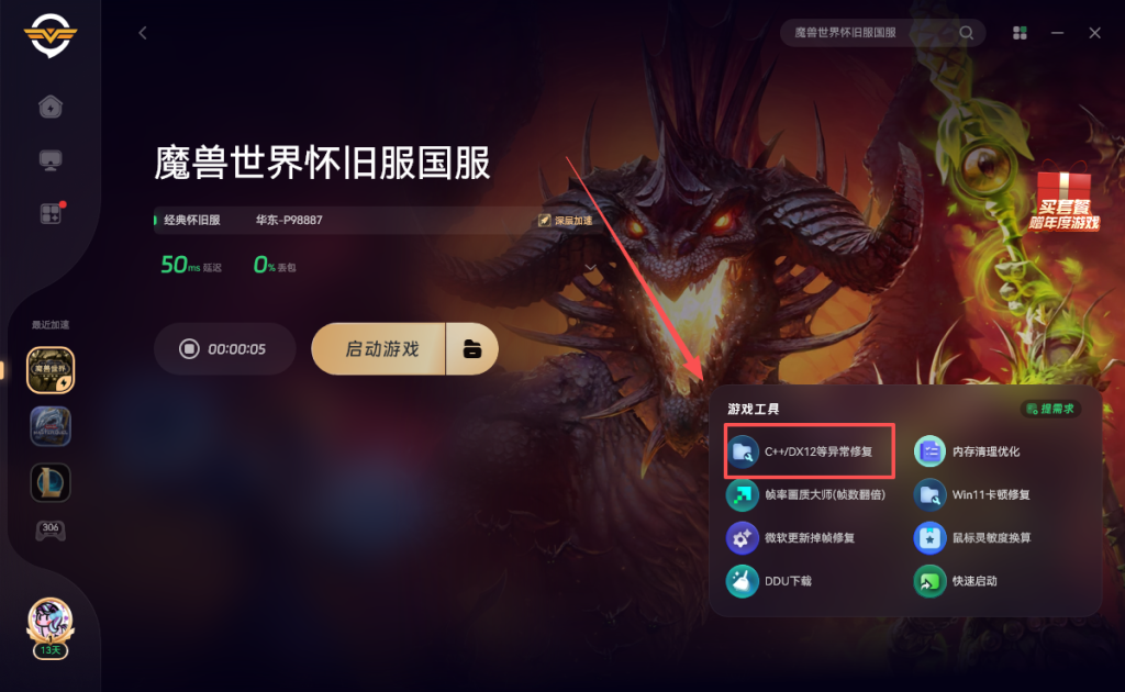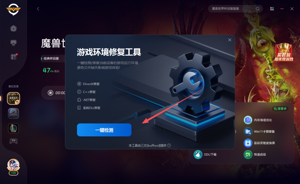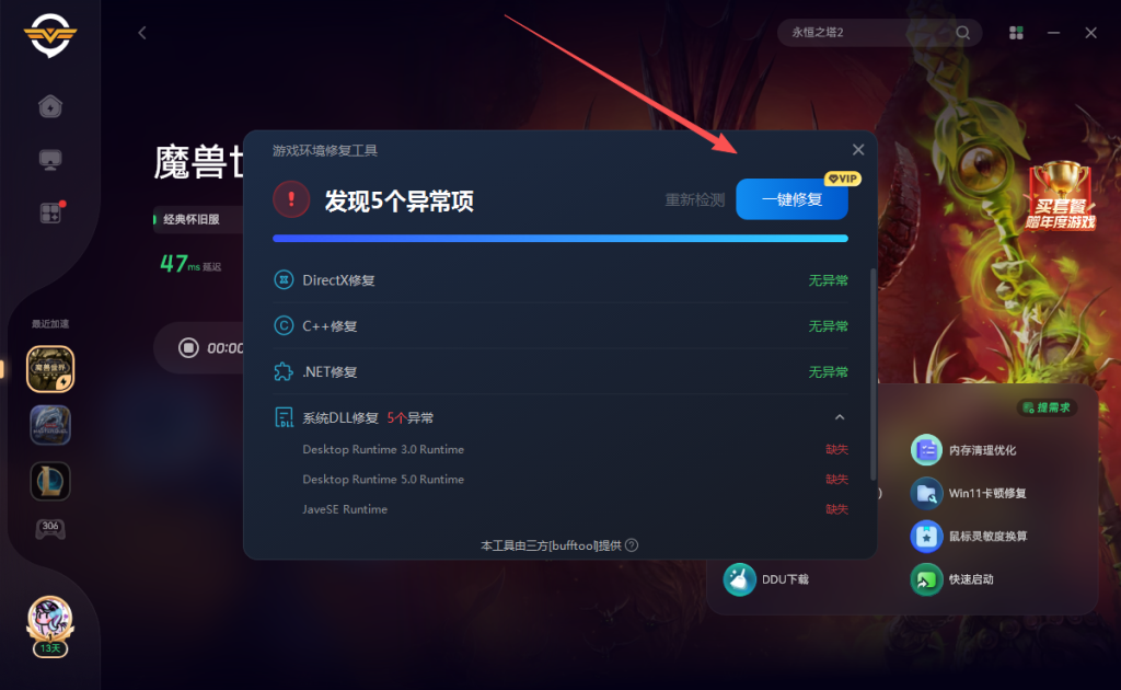 并且可以一键修复!这样就可以解决魔兽这个报错啦