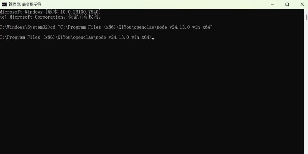 (如: cd “C:\Program Files (x86)\QiYou\openclaw\node-v24.13.0-win-x64”)