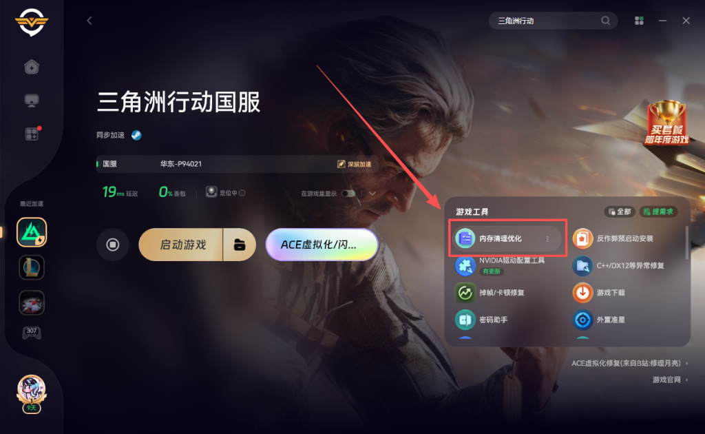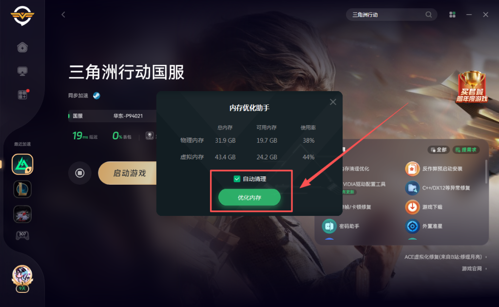 奇游支持一键清理优化内存,打开奇游加速《三角洲行动》点击右侧的内存清理优化